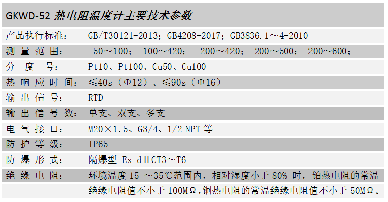 GKWD-52热电阻温度计是利用电阻与温度呈一定函数关系的金属导体或半导体材料制成的接触式温度仪表,可直接测量多种生产过程中从-200~600℃范围内的液体介质、气体介质、蒸汽以及固体表面等的温度,现已成为温度远传仪表的理想选择。