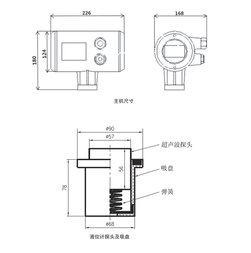 非接触式测量。超声波传感器(探头)在容器外部利用磁力吸附式,无需对被测容器开孔,就可以实现液位测控;